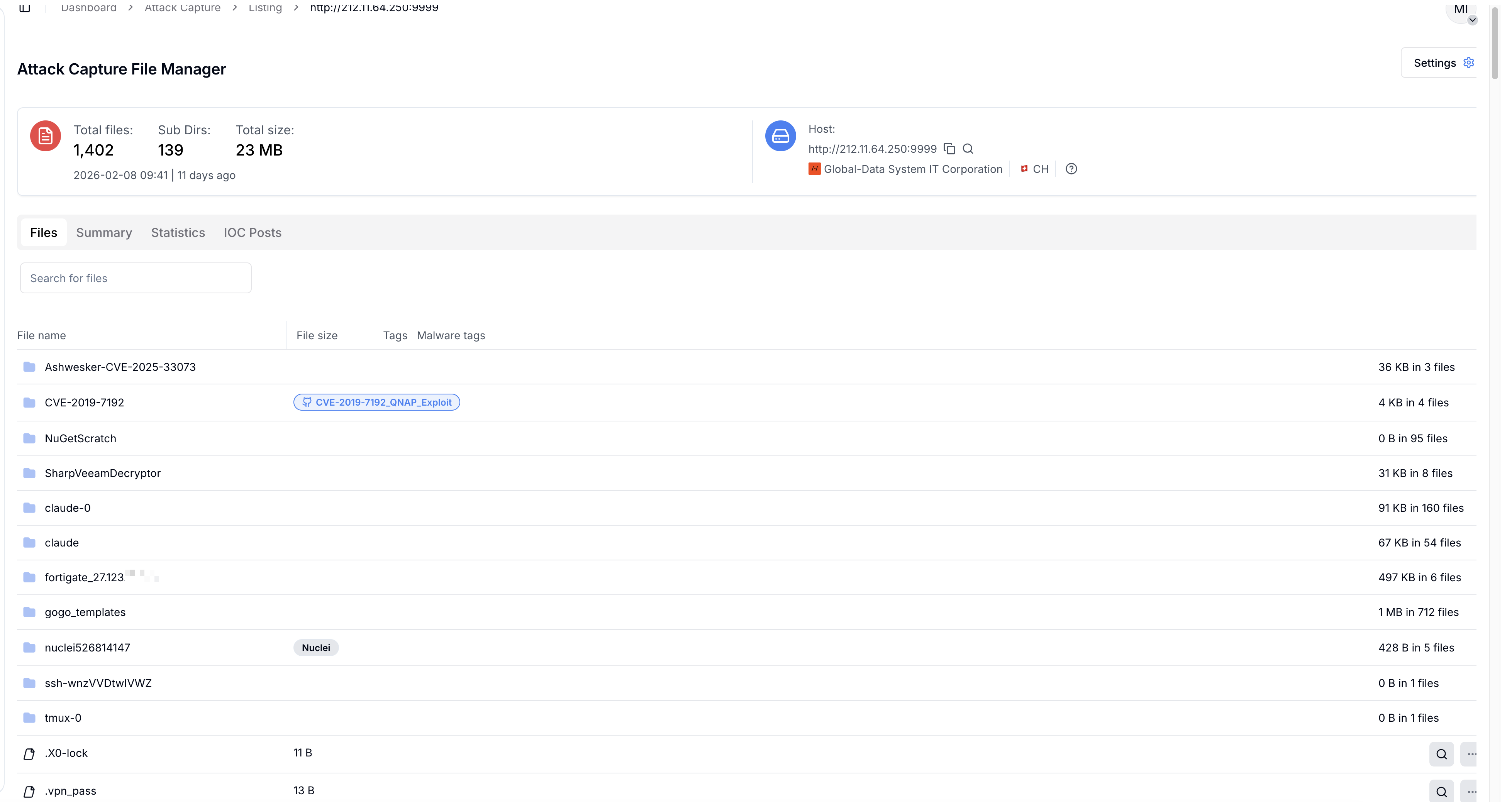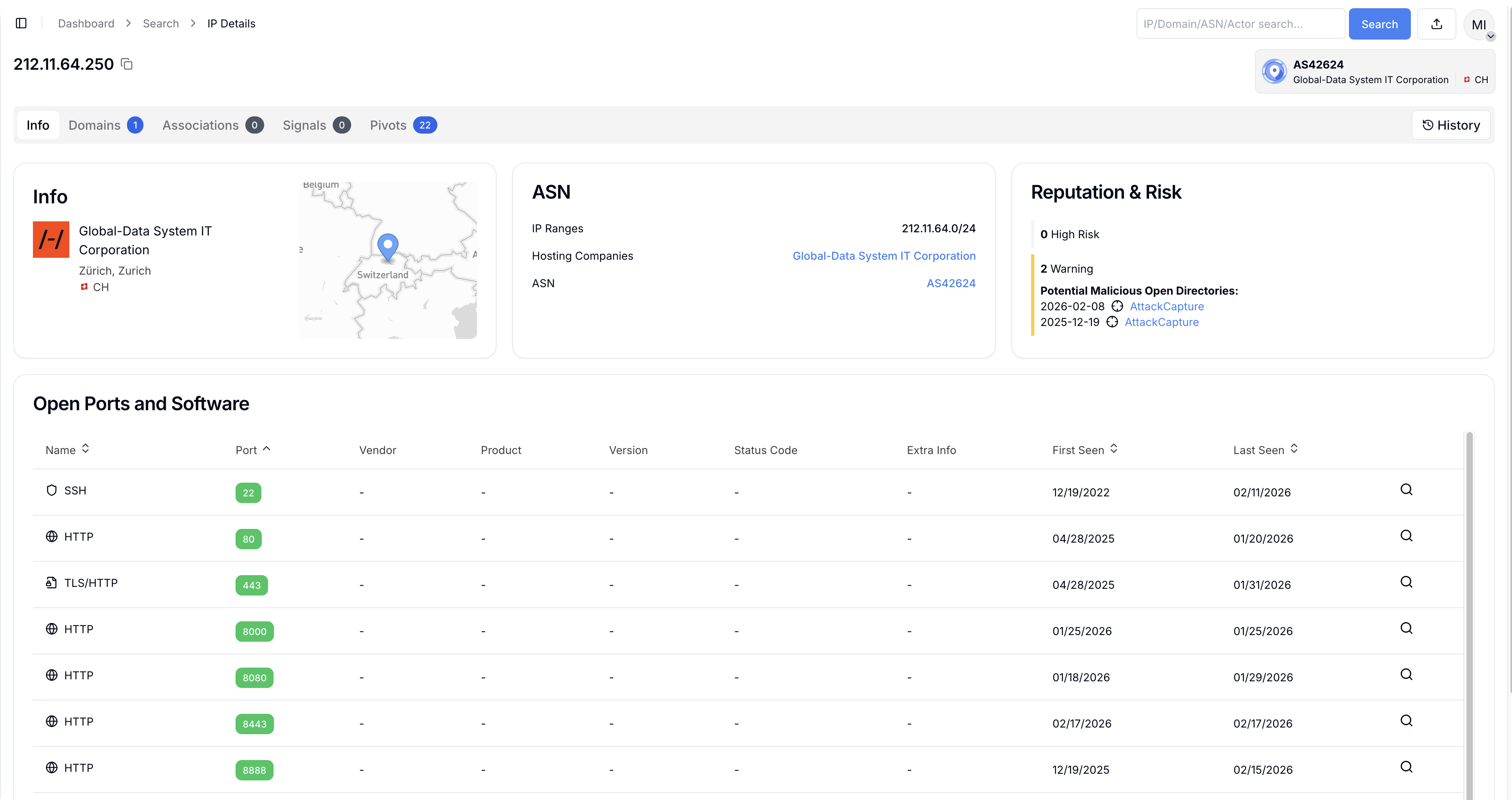 Figure 6: IP summary in Hunt.io showing the historical open directory from December 2025 alongside the February 2026 exposure (Source: Cyber and Ramen)