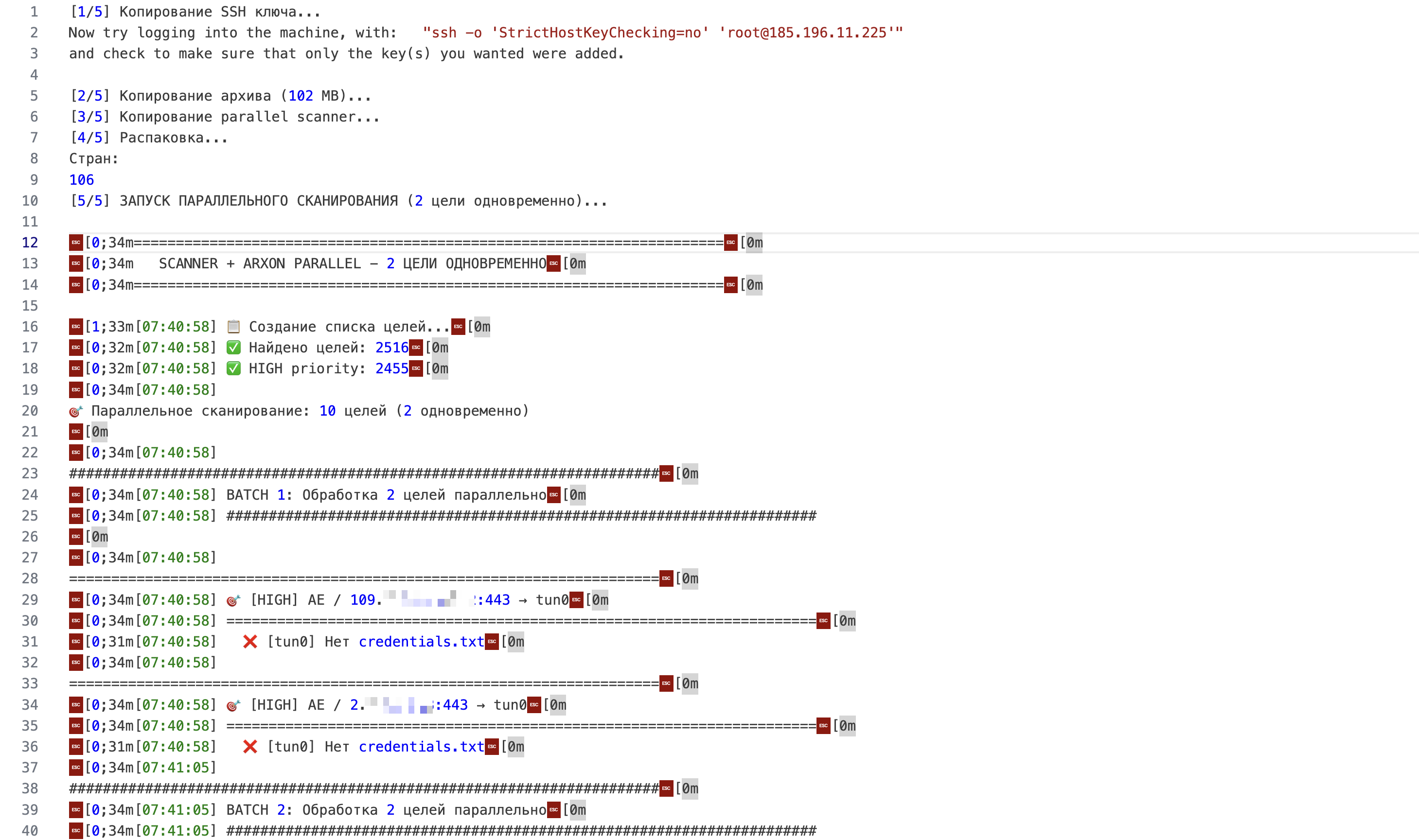 A deployment log file (deploy_output.log) showed a 102MB archive of FortiGate configurations organized by country being transferred to a separate Kali Linux server at 185.196.11[.]225, then launching automated scanning across all of them simultaneously. Output from one of those scans identified 2,516 targets across 106 countries, processed in parallel batches.