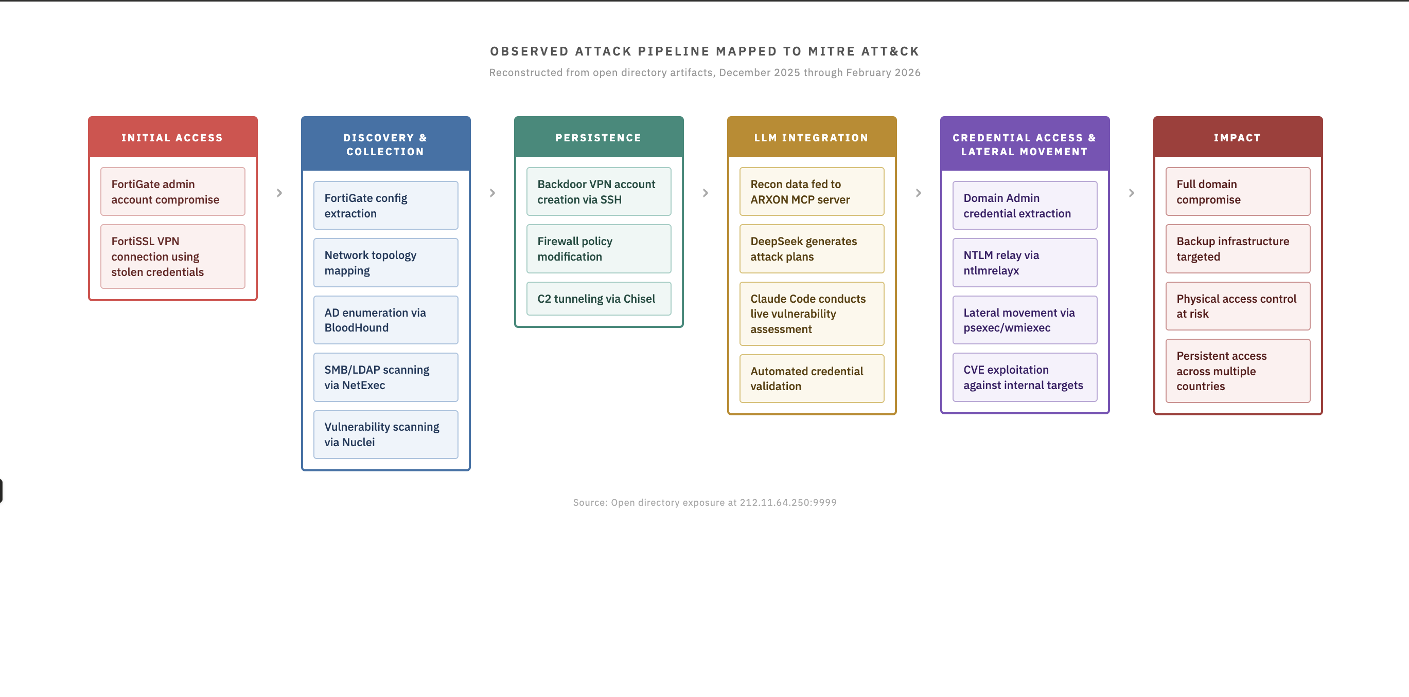 Primary source: LLMs in the Kill Chain: Inside a Custom MCP Targeting FortiGate Devices Across Continents — Cyber and Ramen, February 21, 2026