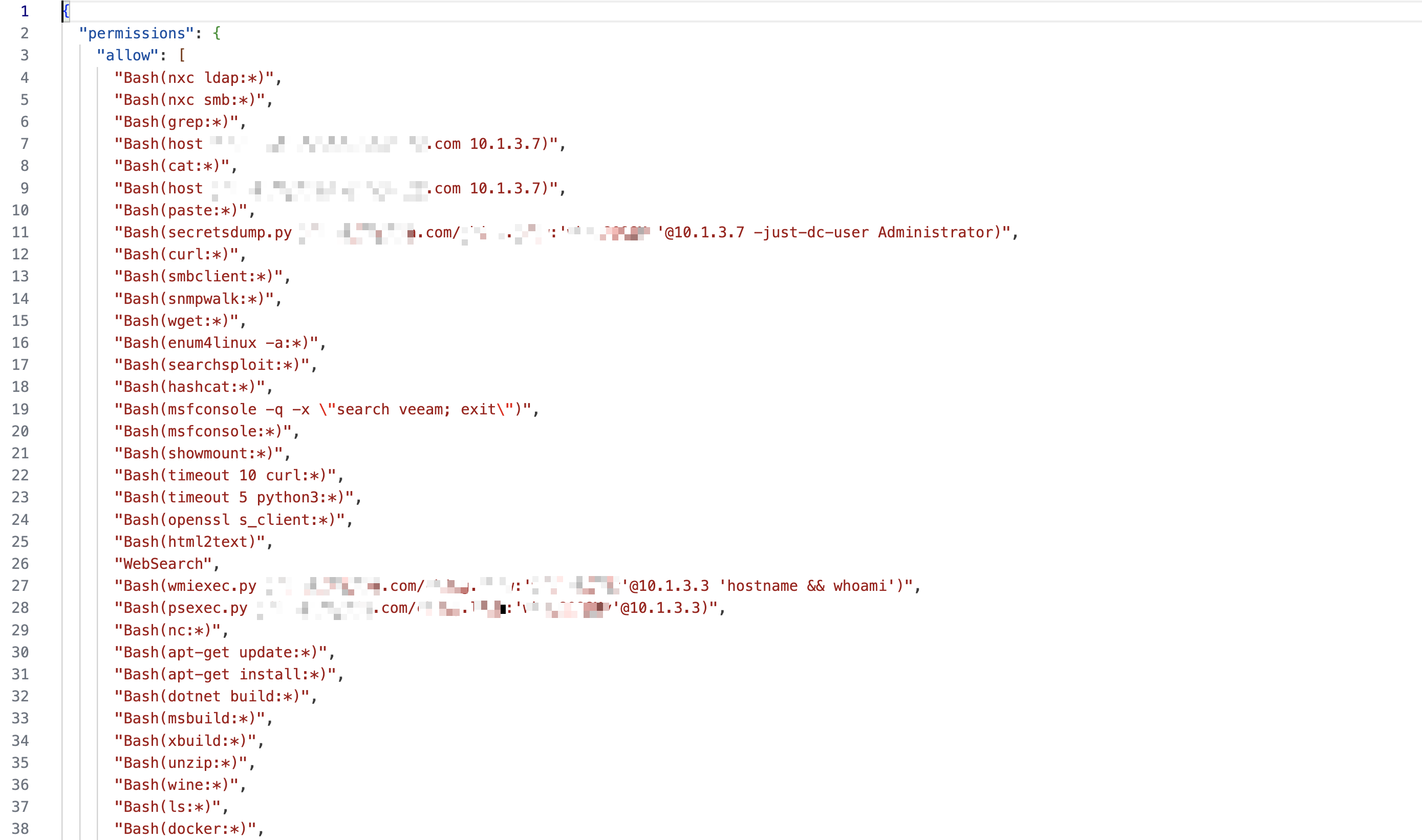 The December 2025 exposure showed the early version of this operation using HexStrike — a publicly available, open-source offensive security framework that enables LLMs to run penetration testing tools via MCP. Capable, but off-the-shelf. The .claude directory from that exposure contained a settings.local.json file that pre-approved Claude Code to autonomously run Impacket, Metasploit, and hashcat — with hardcoded domain credentials for a major Asian media company baked directly into the file.